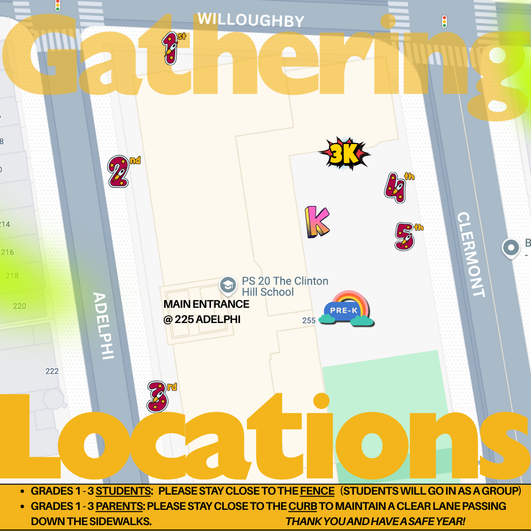 3K (8:10am) + Pre-K (8:10am) will line-up inside the PS20 school yard on Clermont Ave, closer to the school building;