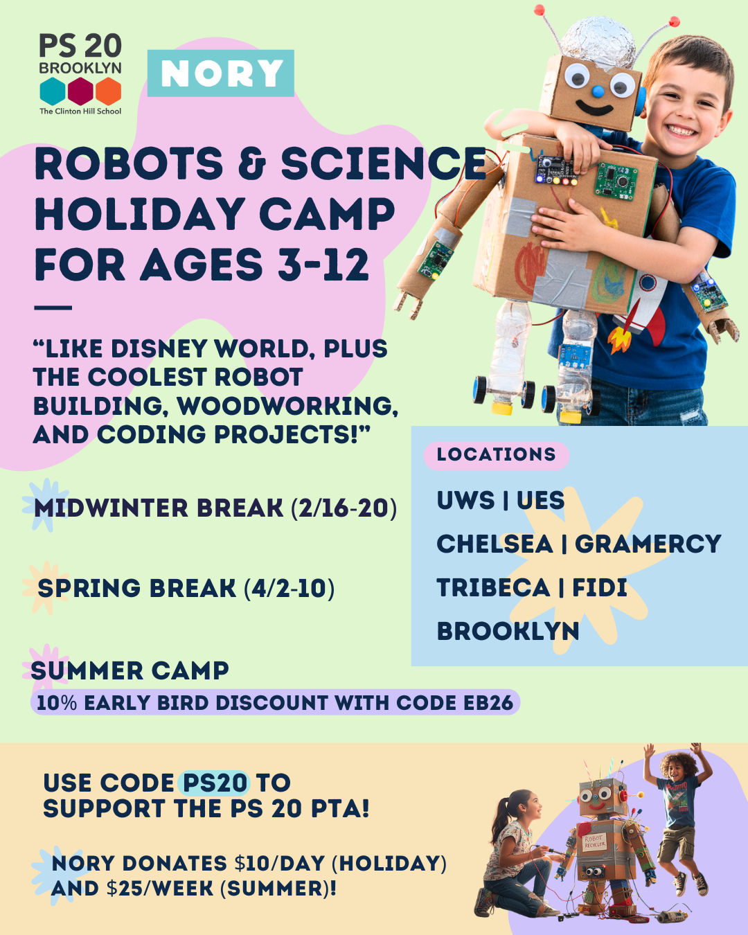 How it works: Use code ✨ PS20 ✨ at checkout. NORY will donate 5% of Holiday Camp and 2.5% of Summer Camp revenue back to the PS20 PTA.